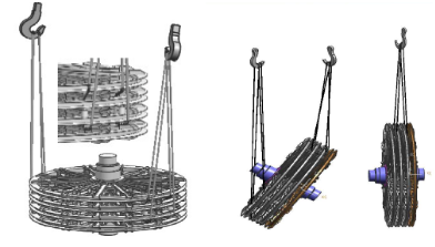 4m以下规格天轮装置:采用两根等长钢丝绳。钢绳兜吊中间两个轮子的轮缘,两根钢丝绳分别挂在同一处槽钢的左、右两侧。为防止轮子变形,两吊挂轮子之间需用千斤顶支垫。