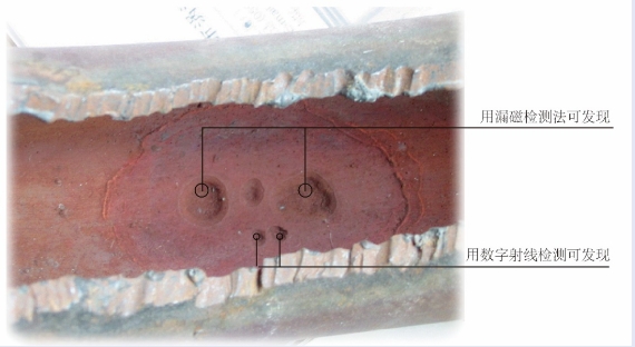 漏磁法检测的基本原理是采用合适的励磁回路将磁场施于管道,使管壁局部磁化饱和,当被检区域管壁存在腐蚀坑或裂纹时,局部管壁磁阻增加,该区域的磁场产生畸变,部分磁场从管壁表面泄漏出来,形成局部区域漏磁场,漏磁场的分布与缺陷的性质和几何尺寸存在关联。用磁敏元件获得漏磁场分布状况并转化为可以观察的电信号,即可获得反映管道的缺陷图形,缺点是只能发现25%以上大小腐蚀坑,小腐蚀坑无法发现,图像不直观。