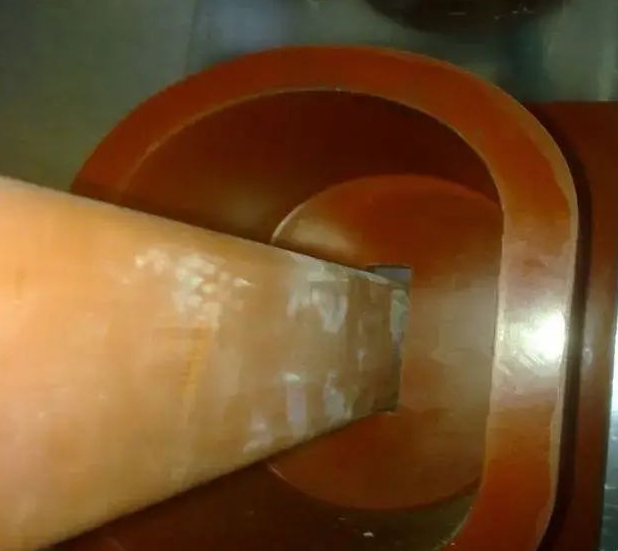图九:这个是直排高压柜的母线筒,母线中间是固定的,但是带鸭嘴弯的母排是穿不过这个孔的,所以不能用这种母线筒,带鸭嘴弯的母排所使用的母线筒中间是块可以移动的橡胶垫。